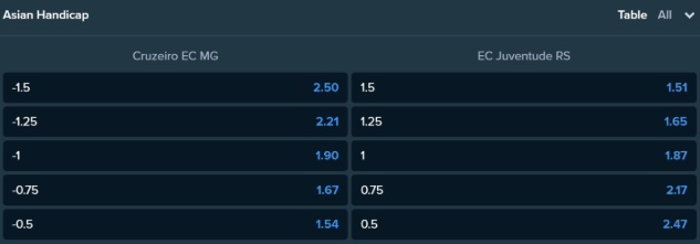 For example: To explain the -1.5/+1.5 handicap line, we will use the Brazilian Serie A match between Cruzeiro and Juventude.