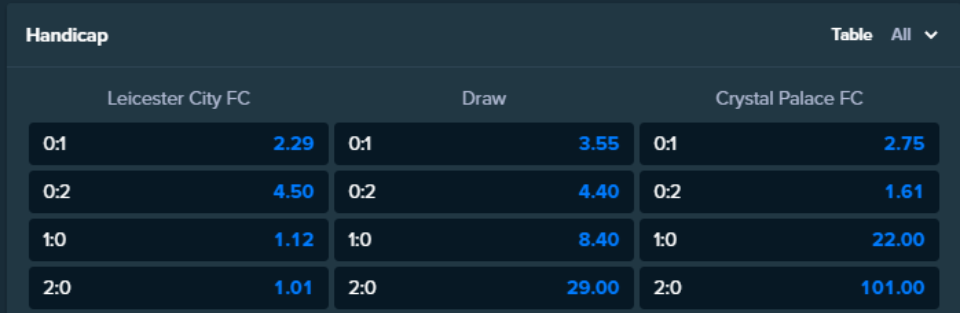 For example: Let's consider an English Premier League (EPL) match between Leicester City and Crystal Palace, where a 0:1 handicap line is applied.